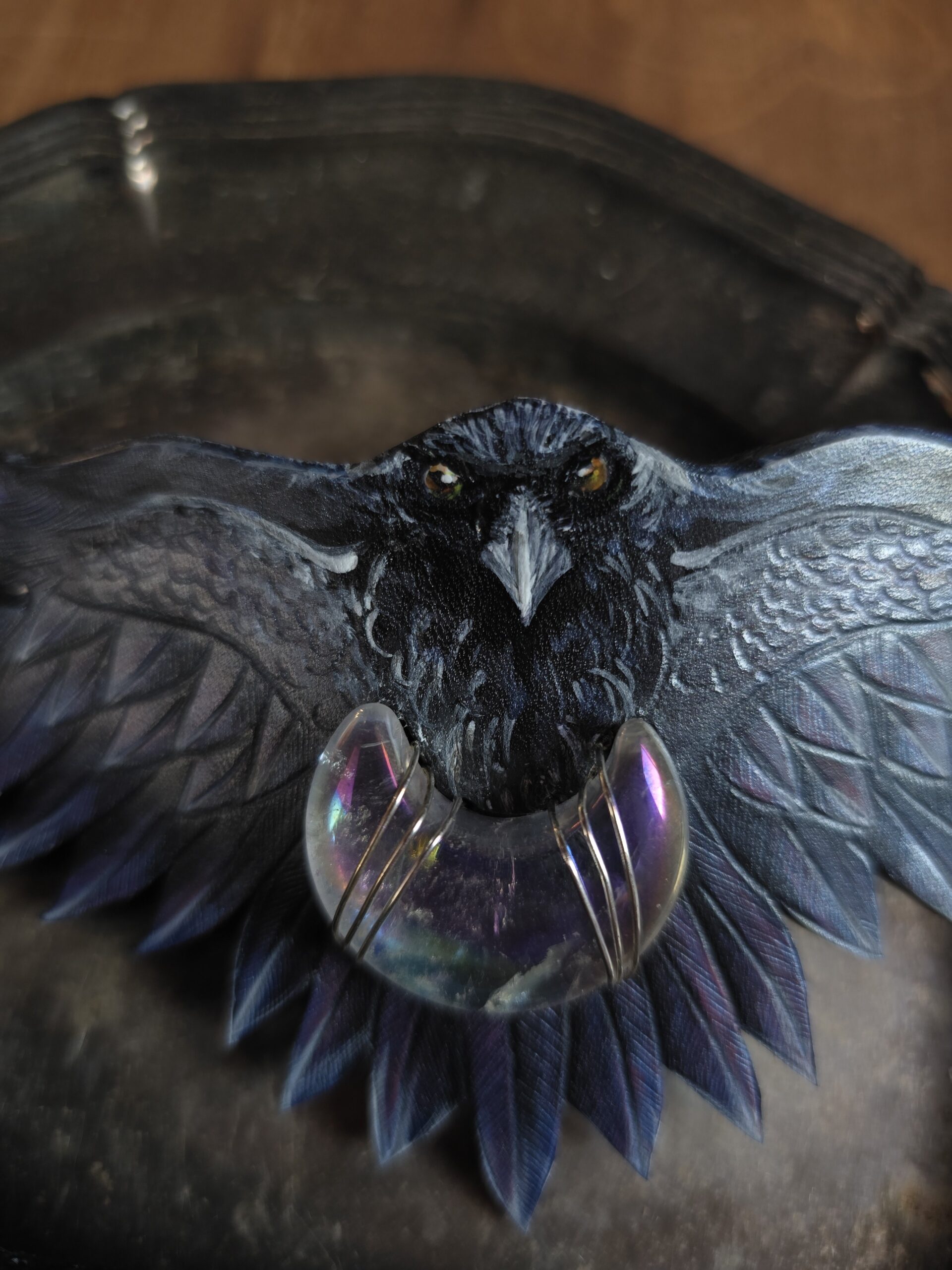 – 100% skóra z recyclingu – metalowe zapięcie – księżyc z kryształu – mocowanie: srebrny drut I filc