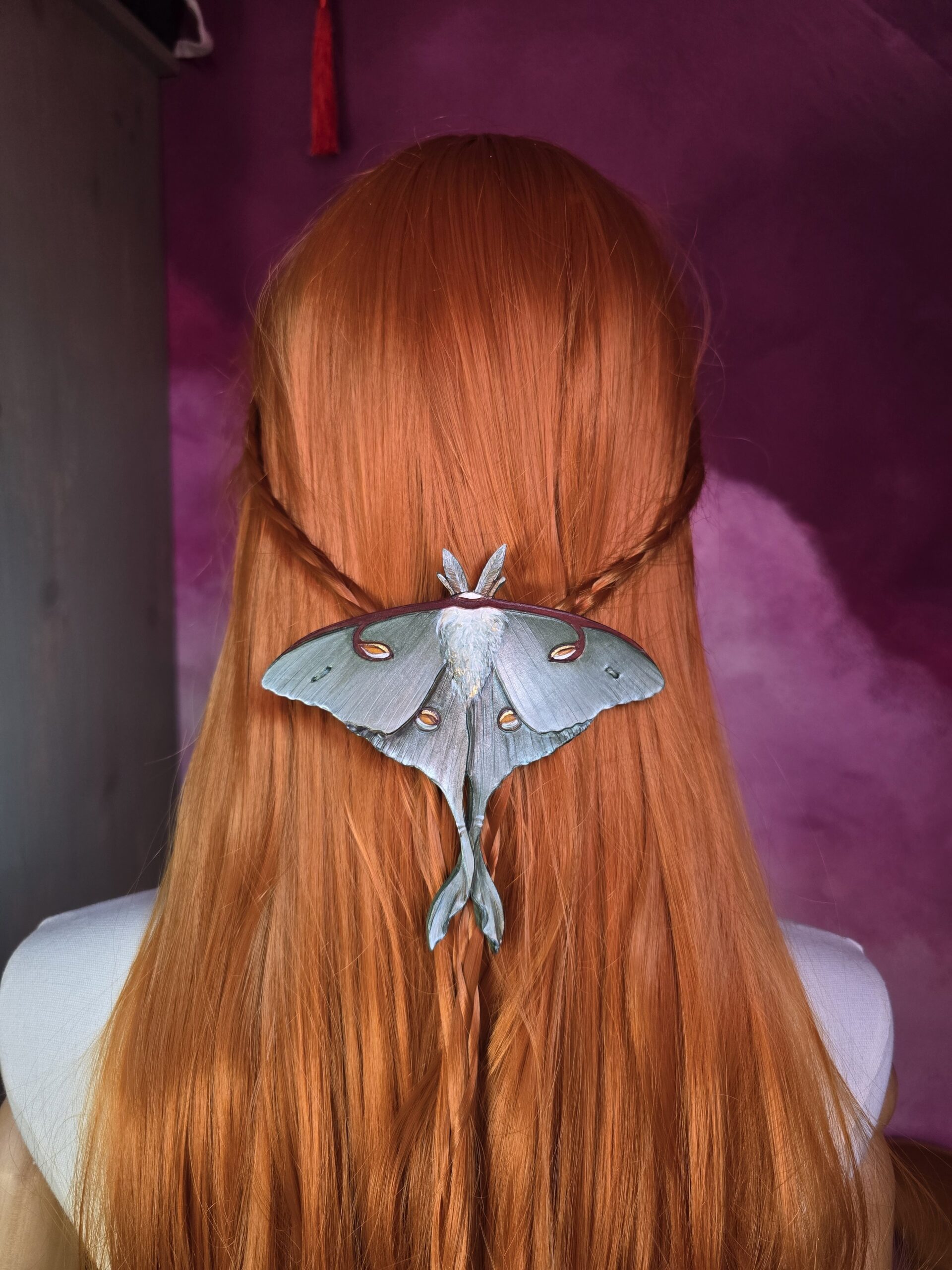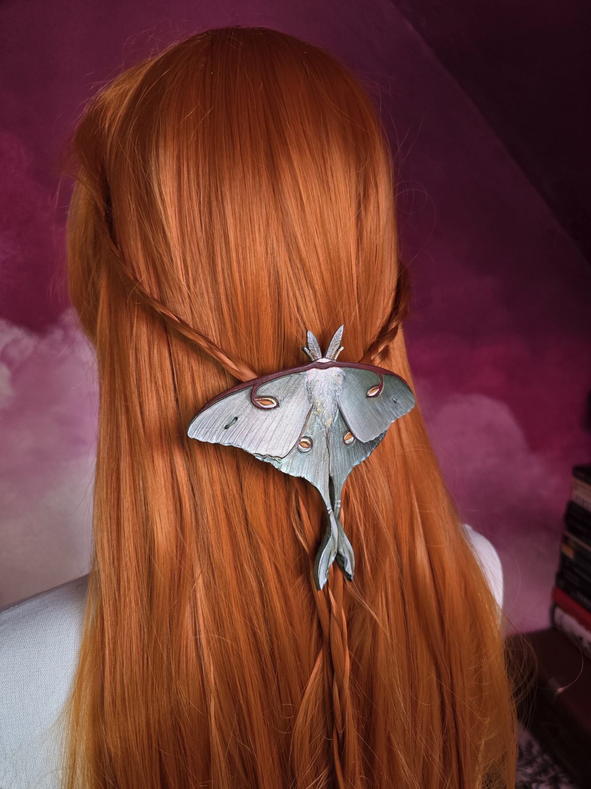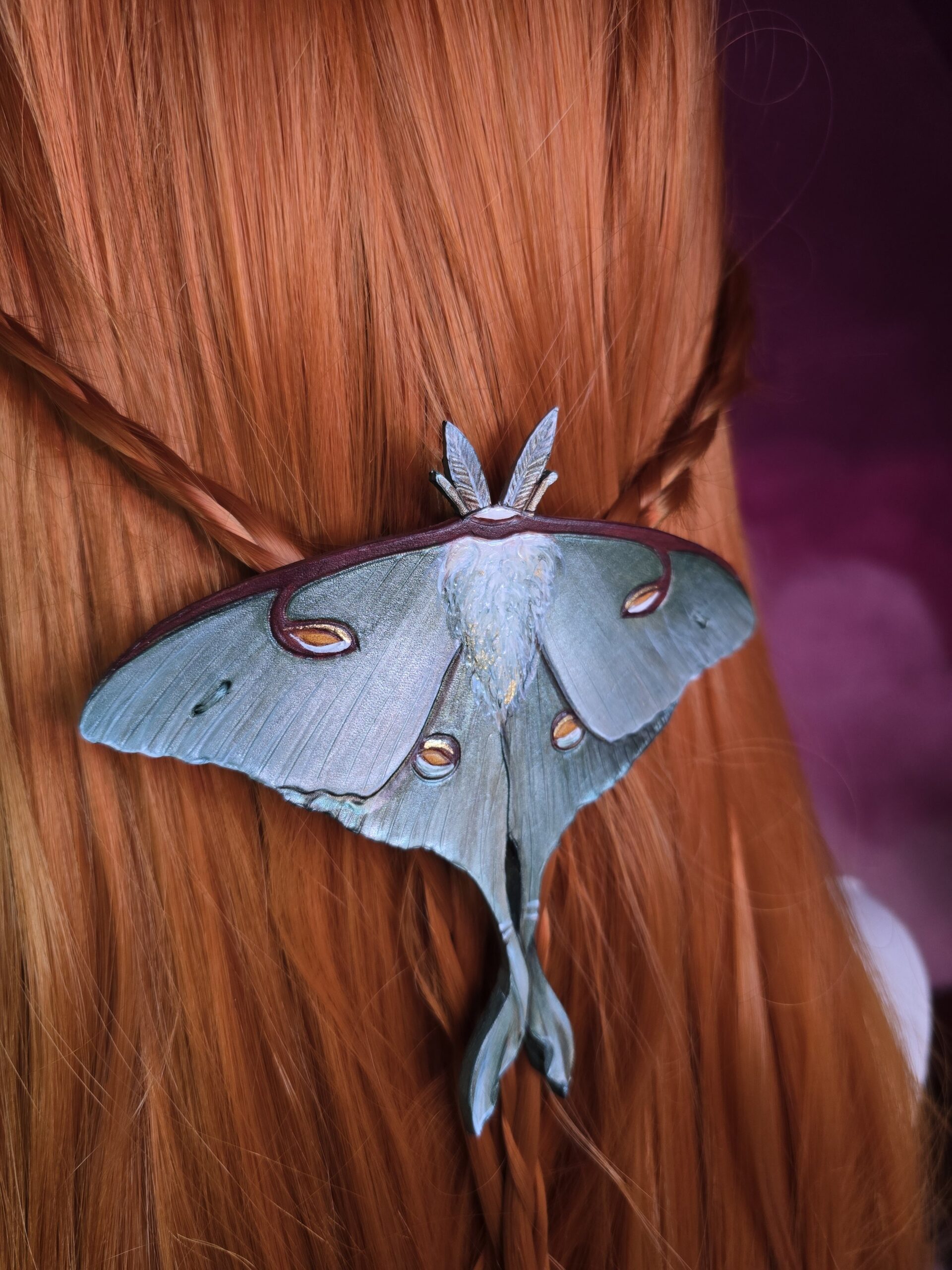 Księżycówka jest niesamowitym owadem z cudnym wzorem, nie sposób nie czuć zachwytu kiedy widzi się je na żywo i podobnie jest z tymi spinkami. Farba połączona ze sproszkowaną muszlą sprawia, że prezentują się wspaniale na włosach.