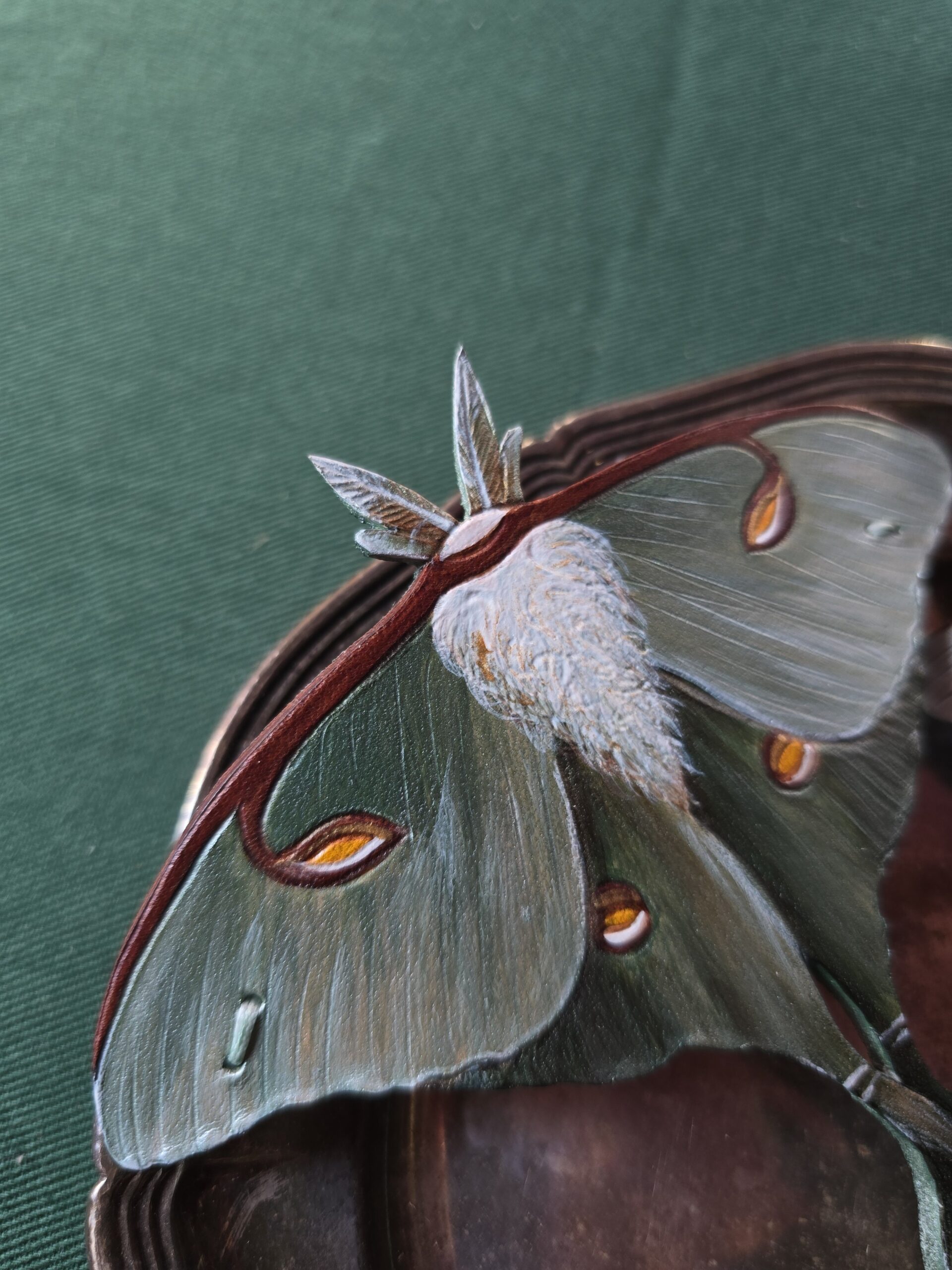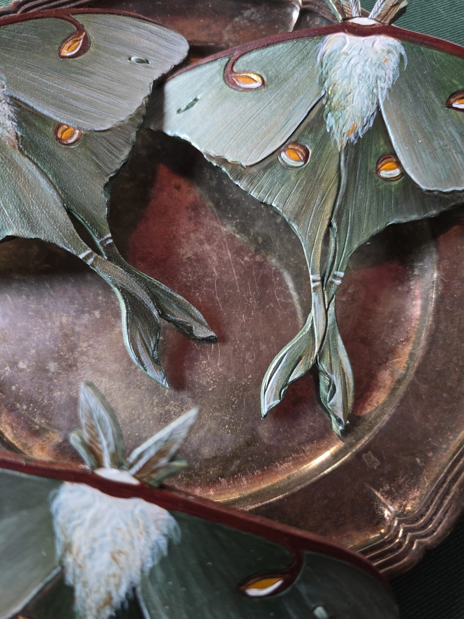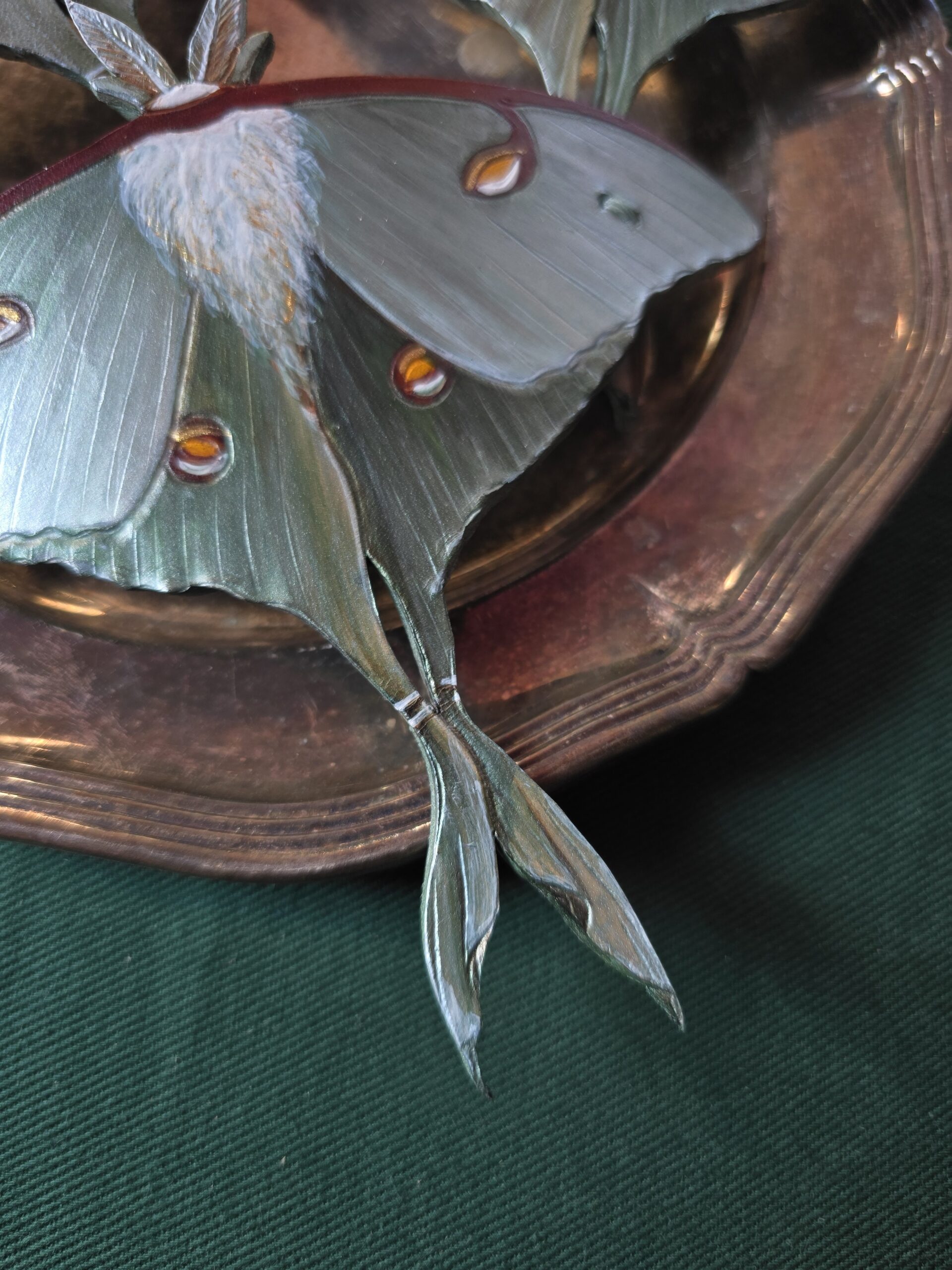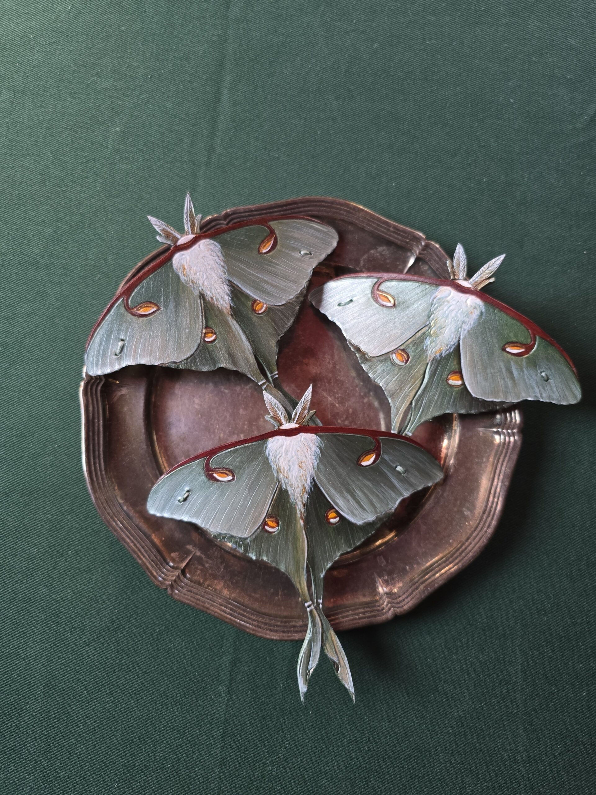 Księżycówka jest niesamowitym owadem z cudnym wzorem, nie sposób nie czuć zachwytu kiedy widzi się je na żywo i podobnie jest z tymi spinkami. Farba połączona ze sproszkowaną muszlą sprawia, że prezentują się wspaniale na włosach.